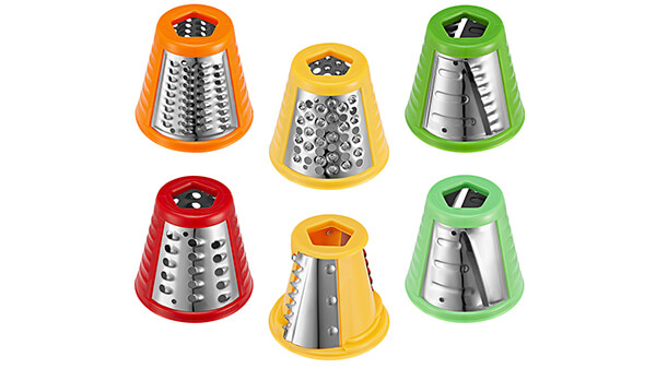 2 тёрочных ножа для крупной и мелкой тёрки, 2 шинковочных ножа для тонкой и толстой шинковки волной, 1 насадка-измельчитель и 1 насадка для нарезки картофеля фри. Заточка ножей не требуется - они изготовлены из высококачественной нержавеющей стали.