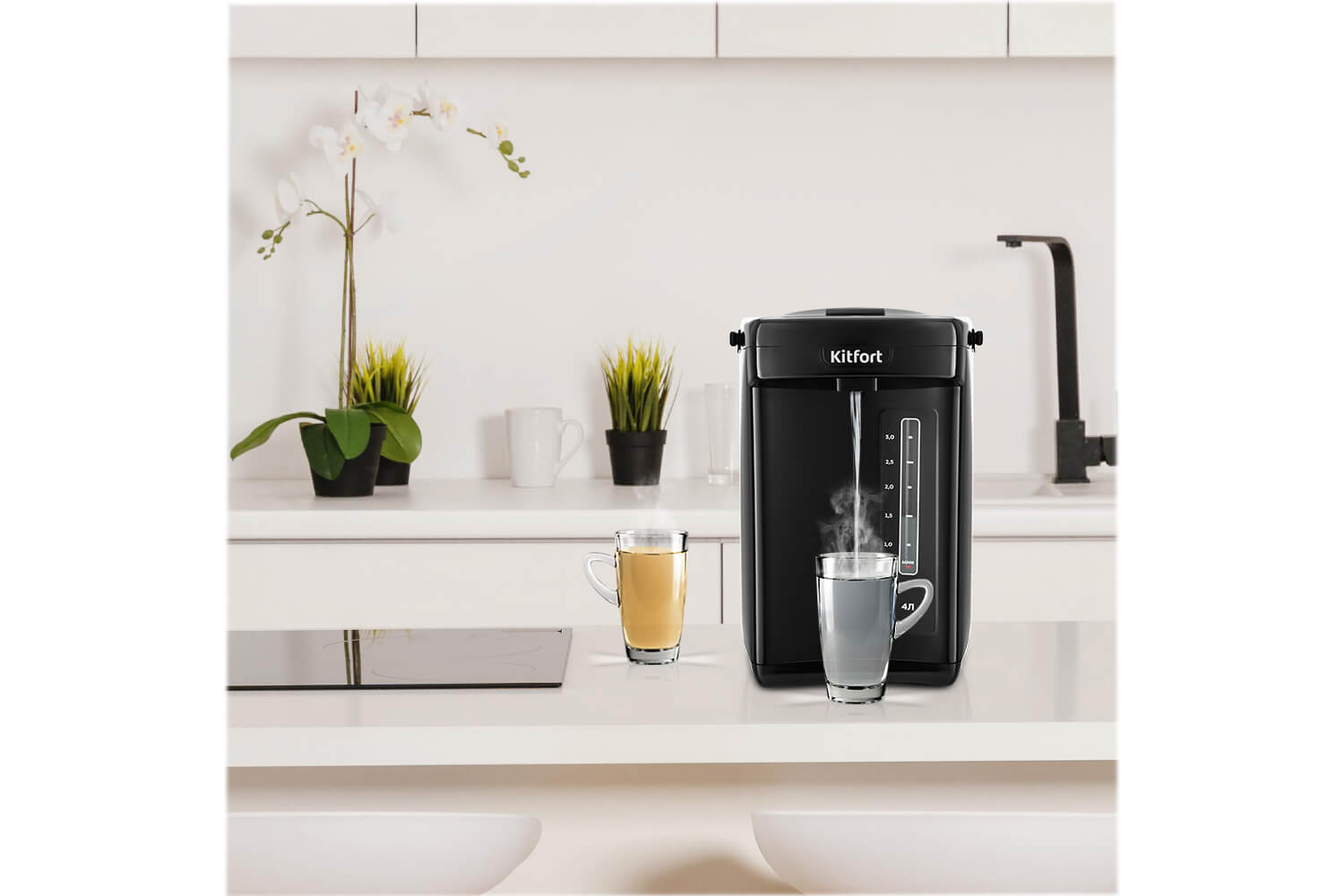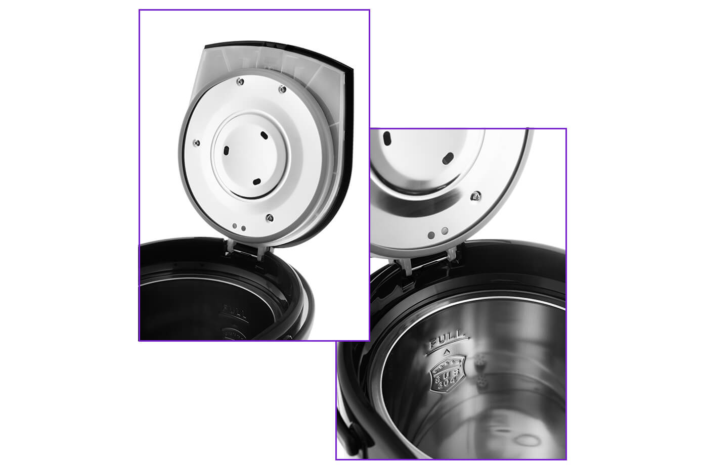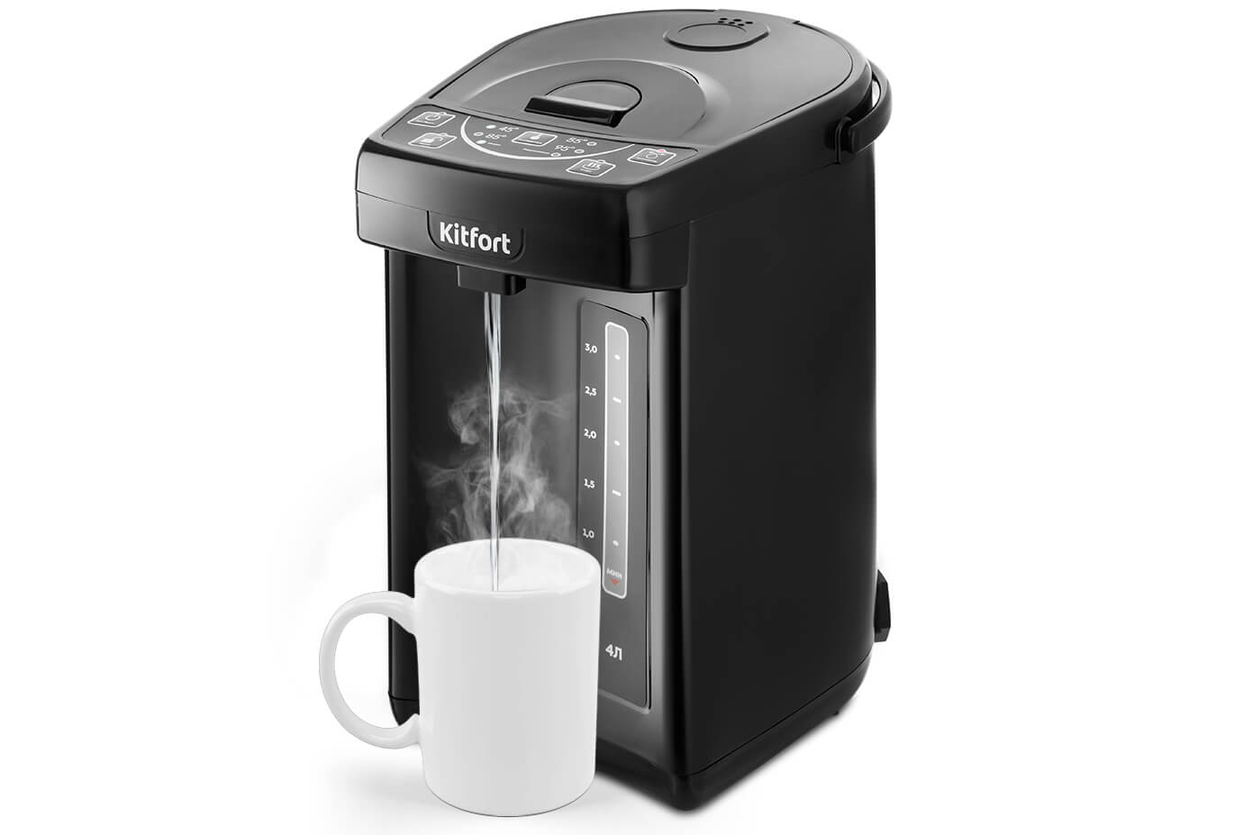 Термопот имеет двойные стенки и резиновый уплотнитель на внутренней металлической части крышки. Это обеспечивает долгое сохранение тепла и экономию электроэнергии. Ёмкость резервуара 4 л, такого объёма хватит на 13 кружек чая ёмкостью 300 мл.