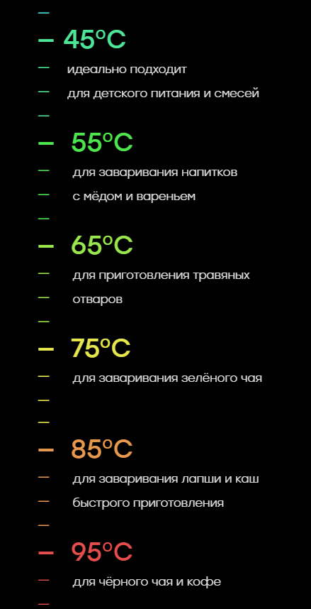 Выбор температуры: 45°C, 55°C, 65°C, 75°C, 85°C, 95°С