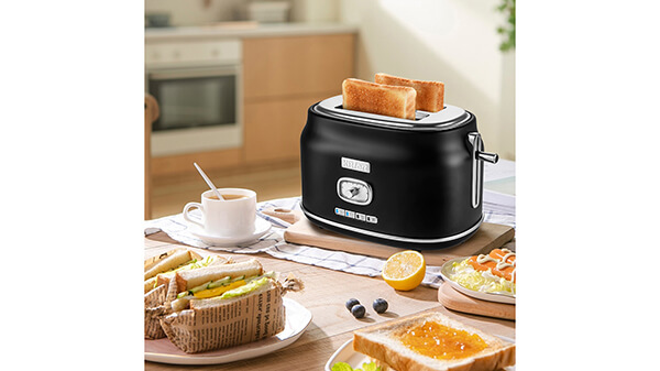 Тостер оснащён регулятором степени обжаривания и 4 кнопками. Есть режим «подогрева» для подогрева готовых тостов, «разморозка», а также режим «бейгл» для поджарки рогаликов или других мучных изделий, которые требуют более интенсивной прожарки.