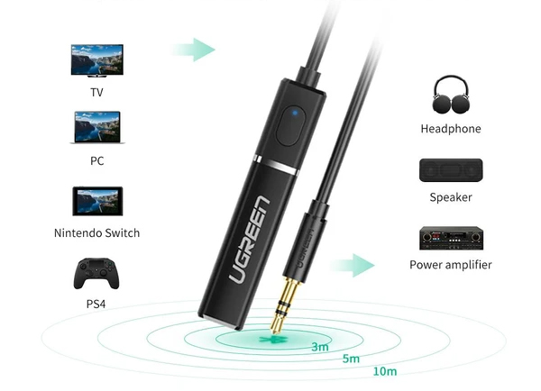 Трансмиттер соединяется с беспроводными колонками или наушниками по Bluetooth версии 5.0. Рабочее расстояние – около 10 метров.