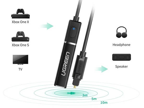 Трансмиттер соединяется с беспроводными колонками или наушниками по Bluetooth версии 5.0. Рабочее расстояние – около 10 метров.