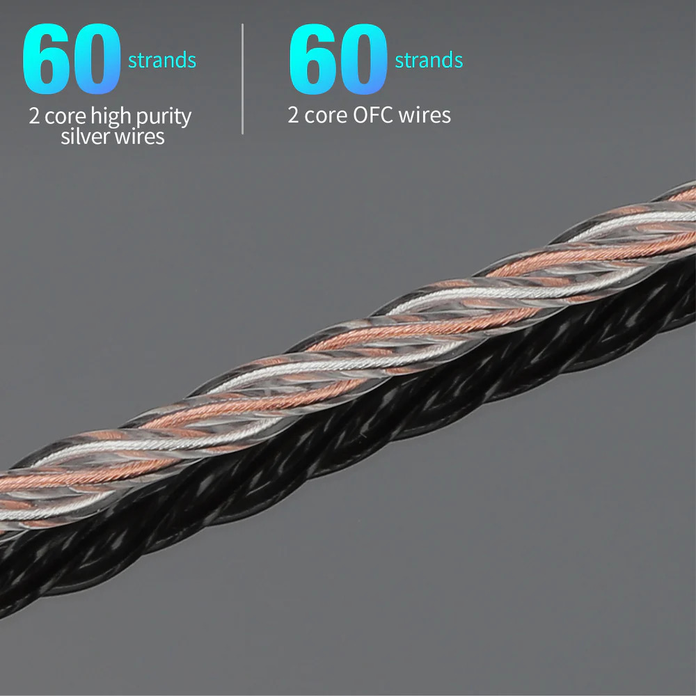 Смешанное плетение из 2 жил из высокочистого серебра + 2 жил из бескислородной меди (по 60 жил в каждой). Серебряные провода обеспечивают более яркий и чистый звук. Провода из бескислородной меди обеспечивают более плавную и мягкую работу.