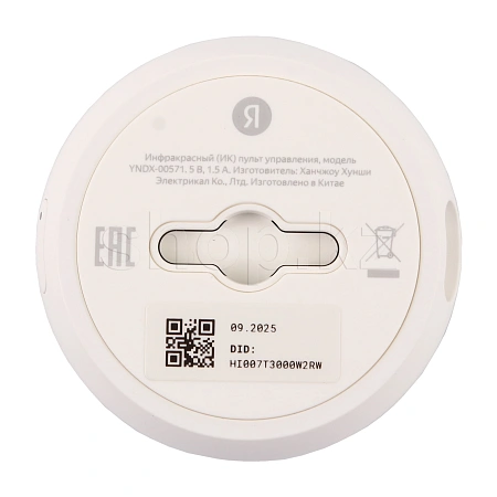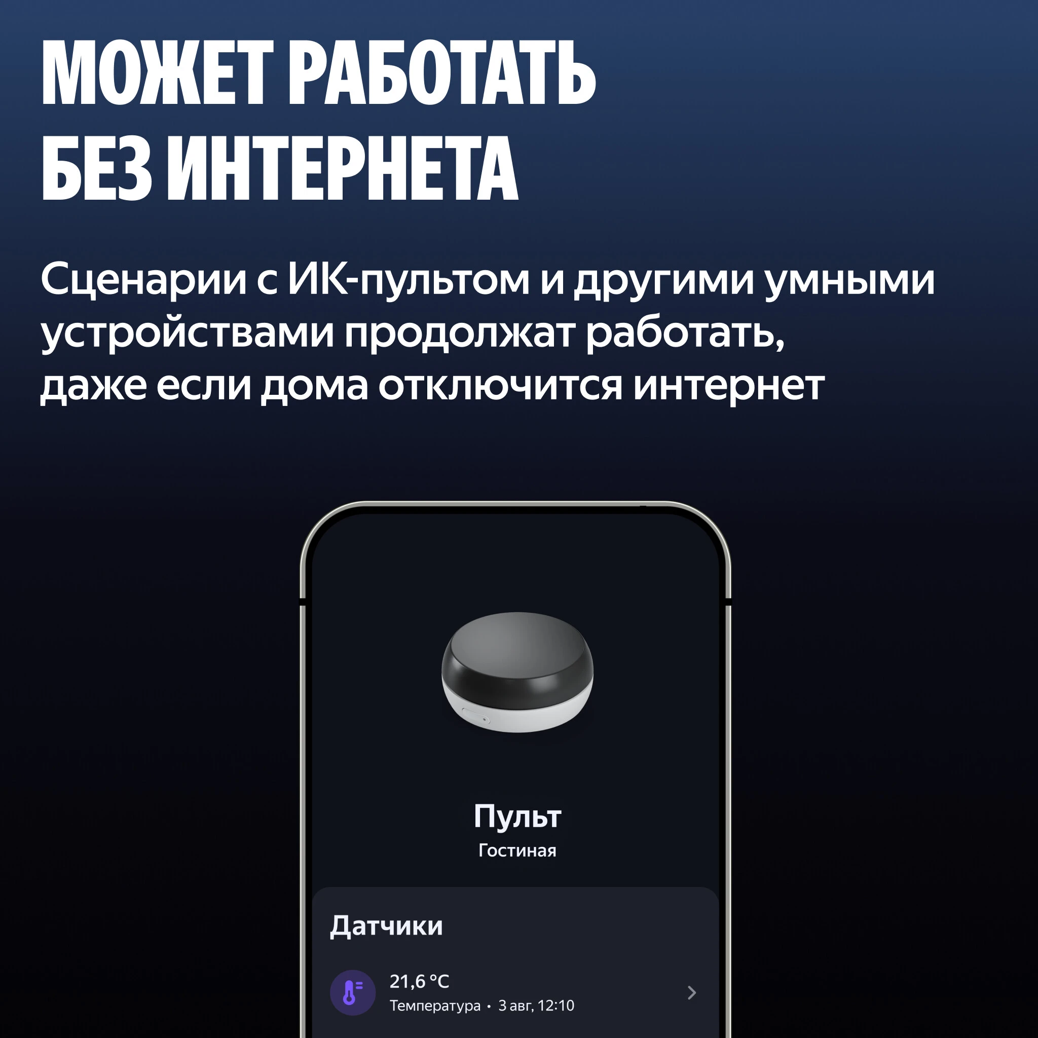 Умный ИК-пульт Яндекс YNDX-00571 оснащён датчиком температуры и влажности и функционирует по Wi-Fi. С его помощью можно контролировать бытовые устройства с ИК-портом, используя голосовое управление или приложение «Дом с Алисой».