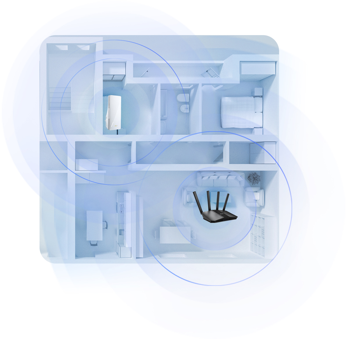 Технология ASUS AiMesh позволяет легко использовать RP-BE58 вместе с другим маршрутизатором, поддерживающим AiMesh, для расширения зоны покрытия вашей сети Wi-Fi. Кроме того, вы можете использовать все функции подключенных маршрутизаторов ASUS в рамках общей ячеистой сети.