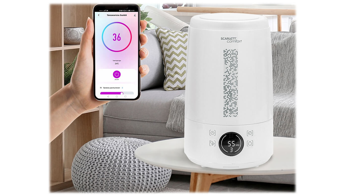 Резервуар вмещает в себя 3.5 литра воды, чего достаточно для увлажнения помещения площадью до 30 квадратных метров. Встроенный гигростат дает возможность регулировать влажность воздуха в помещении и отображает на дисплее текущий уровень влажности, что помогает создать оптимальный микроклимат. Для удобства управления через приложение с вашего смартфона, прибор оснащен Wi-Fi функцией.