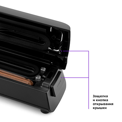 Надёжная фиксация Для надёжности у вакууматора по бокам предусмотрены кнопки открывания крышки и защёлки, которые фиксируют положение крышки при выкачивании воздуха. |