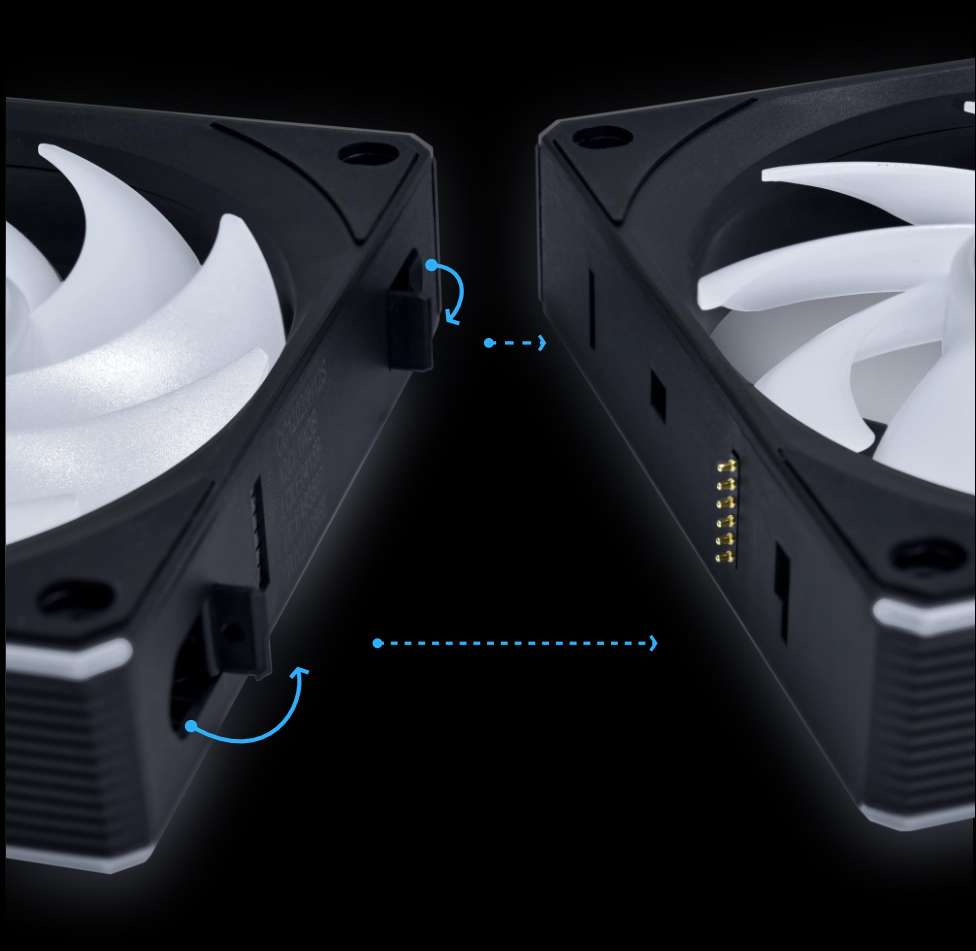 Оснащенный 4-контактным разъемом для автоматического определения PWM и 2-контактным разъемом для дополнительного питания, UNI FAN CL Wireless обеспечивает надежную работу от материнской платы при напряжении 12 В. Длина кабеля может быть отрегулирована с помощью встроенного органайзера, а специальные кабельные гребни позволяют поддерживать порядок в проводке.