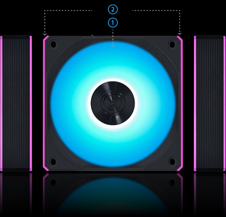 Независимое управление лопастями вентилятора и боковыми полосками для создания многослойных световых эффектов, которые усиливают визуальное воздействие конструкции.