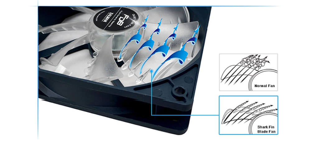 Конструкция лопастей увеличивает воздушный поток и уменьшает турбулентность от вращения вентилятора. Дизайн лопастей, схожий с акульими плавниками и принципиально новая система вращения вентилятора, обеспечивают практически полную тишину и максимальную долговечность.