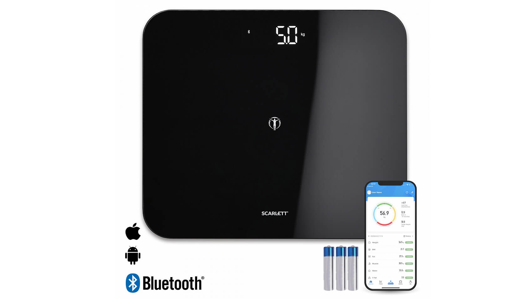 Умные весы Scarlett SC-BS33ED100 – устройство, которое не просто определяет ваш вес, индекс массы и тела. Динамика всех параметров хранится в приложении в вашем смартфоне, помогая поддерживать ваше тело в отличной форме. Приложение совместимо с iOS и Android.