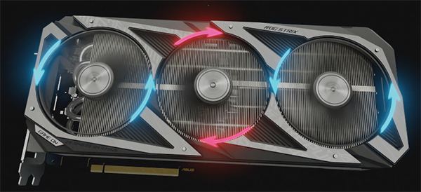 Кольцо-ограничитель у крайних вентиляторов сделано тоньше, чтобы обеспечить больший приток воздуха с боков, а дополнительные лопасти и широкое ограничительное кольцо центрального вентилятора способствуют увеличению статического давления, под которым воздушный поток ударяется в теплорассеиватель графического процессора.