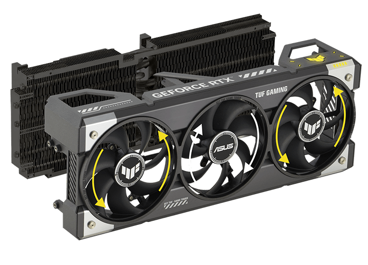 Два внешних вентилятора вращаются против часовой стрелки, чтобы уменьшить турбулентность и улучшить распределение воздуха. Все три вентилятора останавливаются при температуре графического процессора ниже 50°C, обеспечивая более тихую работу при лёгких задачах. Они возобновляют работу при температуре выше 55°C, следуя кривой скорости, которая обеспечивает баланс производительности и уровня шума.