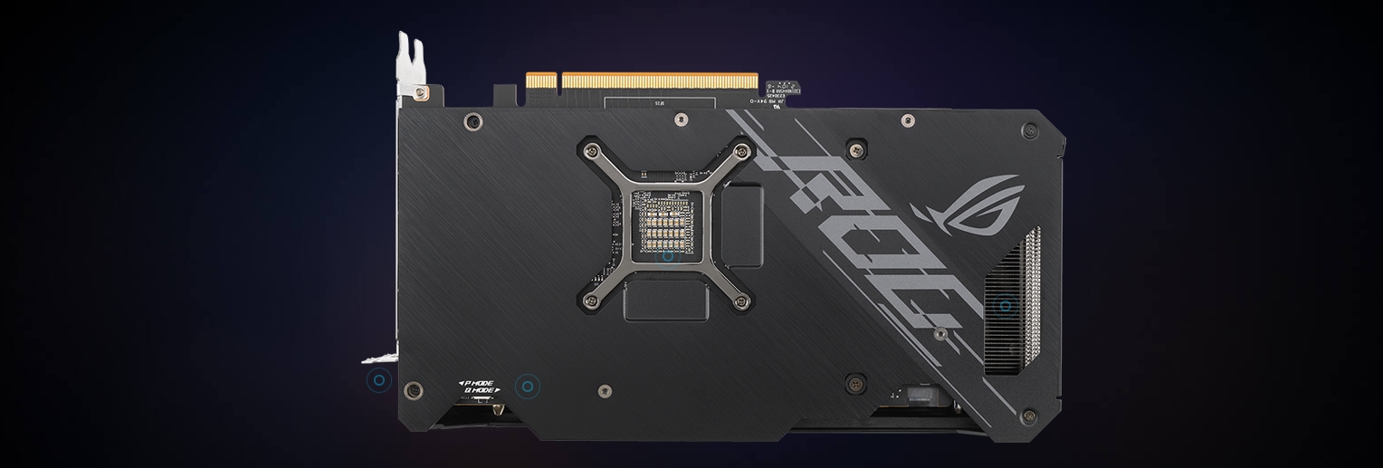 Эффектный кожух с металлическими вставками отражает эстетику дизайна материнских плат ROG и ROG Strix. Текстурированные акценты в цветовой гамме оттенков серого плавно переходят в тонкую сборку или производят поразительное впечатление, когда карта установлена вертикально и освещена светодиодами корпуса.