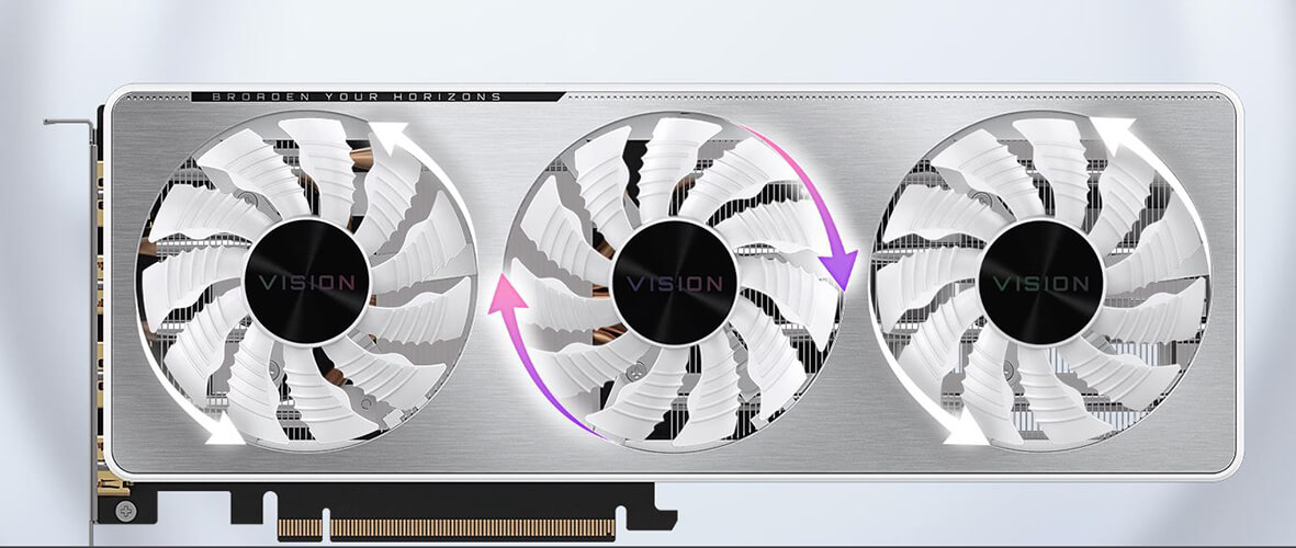 Система охлаждения представляет собой три 80 мм вентилятора с уникальным дизайном крыльчатки, пять медных композитных трубок прямого контакта с GPU, поддержку технологии пассивного охлаждения 3D Active Fan, и специальный дизайн бекплейта, для обеспечения беспрепятственного отвода горячего воздуха от платы.