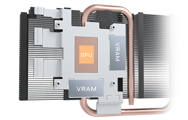 Медная пластина напрямую контактирует с графическим процессором, а композитные медные тепловые трубки быстро передают тепло от графического процессора и видеопамяти к радиатору.