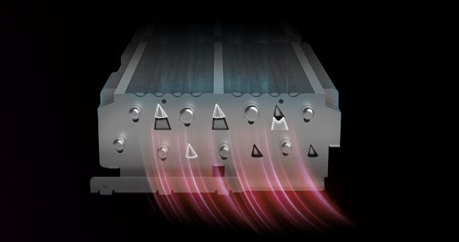 Вентиляторы TORX 5.0 – весьма эффективное средство доставки воздушного потока в радиатор. Соединенные специальными дугами лопасти, наклоненные под углом в 22°, поддерживают высокое давление даже при низкой скорости вращения. Как результат, воздушный поток стал на 23% мощнее по сравнению с осевыми вентиляторами.