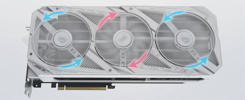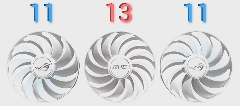 Кольцо-ограничитель у крайних вентиляторов сделано тоньше, чтобы обеспечить больший приток воздуха с боков, а дополнительные лопасти и широкое ограничительное кольцо центрального вентилятора способствуют увеличению статического давления, под которым воздушный поток ударяется в теплорассеиватель графического процессора.