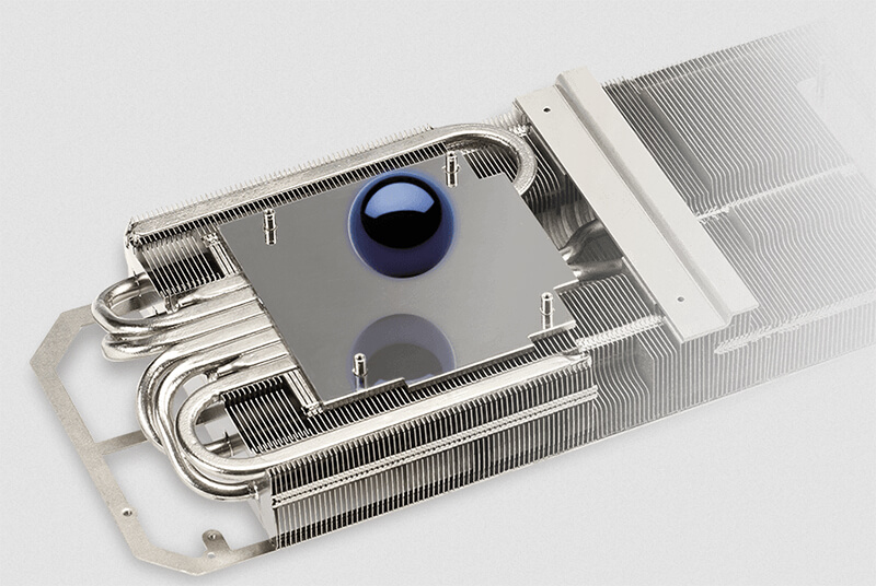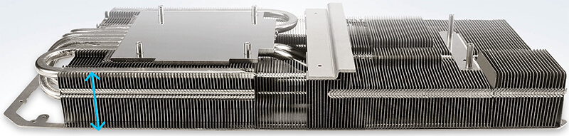 Тепловые трубки распределяют тепло по ребрам радиатора, заполняющим большое пространство, предоставляемое 2.9-слотовым форм-фактором видеокарты. Увеличенный размер радиатора по сравнению с моделями предыдущего поколения гарантирует эффективное охлаждение нового высокопроизводительного графического чипа.