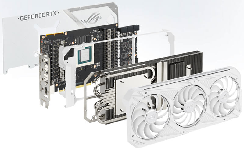 Данная видеокарта серии Strix выделяется среди обычных своей белоснежной расцветкой – кожуха, усилительной пластины, вентиляторов. Она будет идеальным выбором для сборки мощного игрового компьютера в белом цвете.