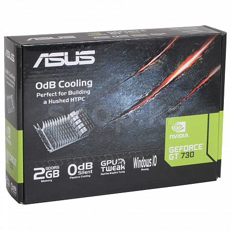 ASUS GT 730 – это видеокарта начального уровня, оснащенная пассивной (без использования вентиляторов) системой охлаждения, что делает ее идеальным выбором для бесшумных мультимедийных компьютеров. В устройстве применены эксклюзивные технологии ASUS, направленные на повышение стабильности работы, а для гибкой настройки его параметров предлагается удобная утилита GPU Tweak II.