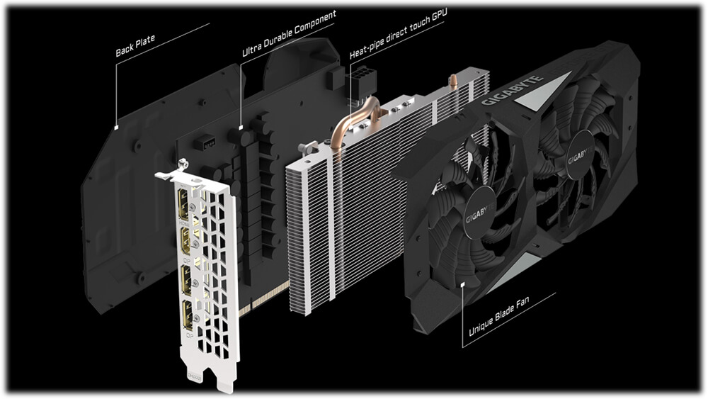 Система охлаждения WINDFORCE 2X включает два 90-миллиметровых вентилятора с уникальными лопастями, попеременное вращение, одна композитная медная тепловая трубка, непосредственно соприкасающаяся с графическим процессором, и технология 3D active fan, вместе обеспечивающие эффективный отвод тепла для более высокой производительности при низких температурах.