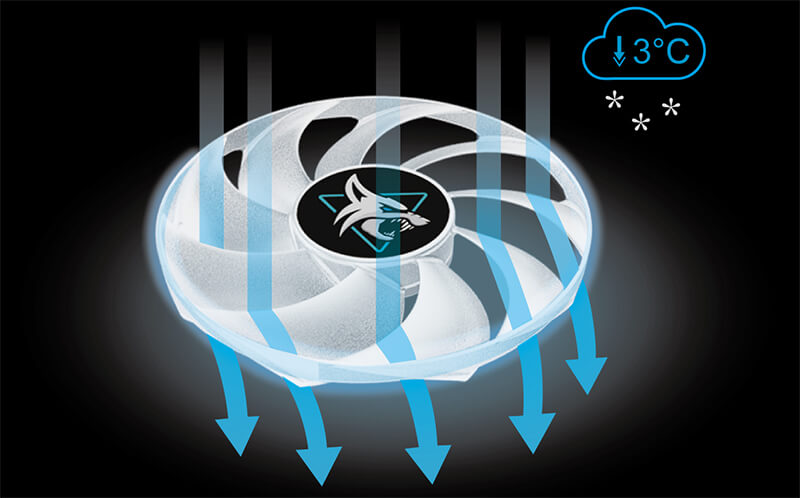 Новейшая 9-лопастная конструкция наших вентиляторов создает лучший воздушный поток и давление воздуха при том же уровне шума, улучшая эффективность охлаждения и снижая температуру GPU более чем на 3℃ по сравнению с предыдущими поколениями.