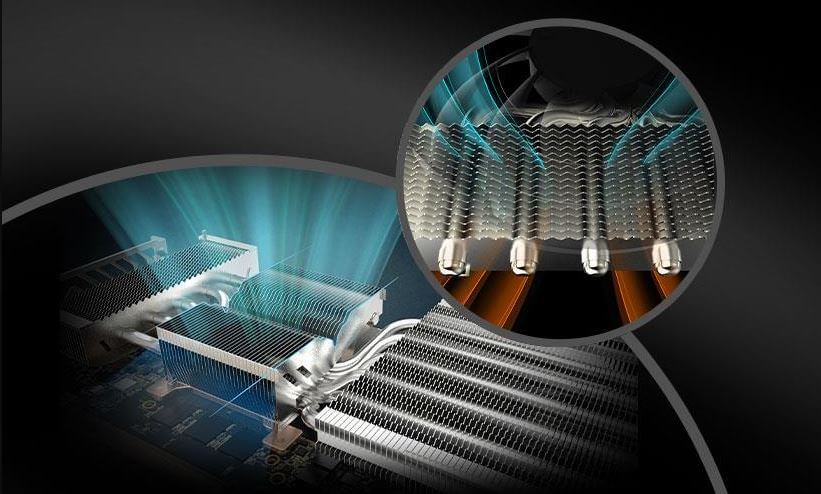 V-образная конструкция пластин радиатора охлаждения графического процессора ускоряет и централизует воздушный поток вокруг графического процессора, чтобы эффективно рассеивать тепло.