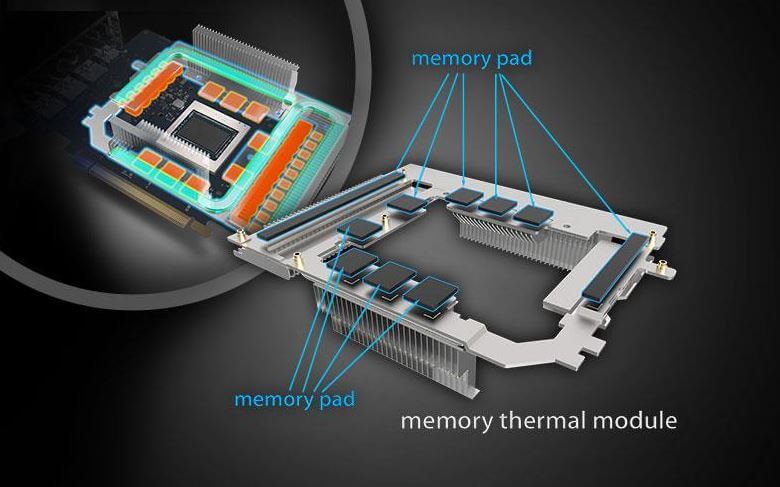 Комбинированный модуль охлаждения памяти и VRM охлаждает память, MOSFET-транзисторы и дроссели. В нижней части модуля добавлены две тепловые трубки, чтобы отводить тепло от компонентов с большей эффективностью.