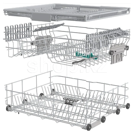 Верхняя корзина регулируется по высоте, что позволяет оптимально использовать пространство посудомоечной машины. Также в комплекте предусмотрены две подставки для чашек и крупная сетка корзины для удобного размещения посуды различных размеров и форм.