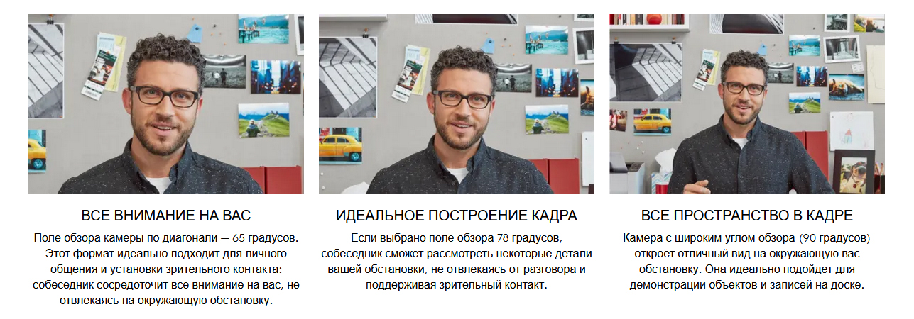 Выберите одну из трех готовых настроек поля обзора, чтобы максимально точно поместить изображение в кадр. Чтобы в кадре были только голова и плечи, установите угол обзора по диагонали 65°. Если нужно показать интерьер, в котором проходит конференция, выберите угол обзора по диагонали 78° или 90°. Для всех вариантов поддерживается пятикратное увеличение в формате высокой четкости с великолепным разрешением 4K.