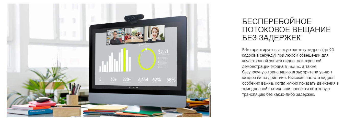 Brio — это веб-камера, которая за счет технологий (включая автофокусировку и пятикратное увеличение в формате HD) обеспечивает кристальную четкость видео с превосходными разрешением, частотой кадров, цветопередачей и детализацией. Brio гарантирует непревзойденную четкость, плавность и детализацию видео в формате 4K Ultra HD при частоте 30 кадров в секунду, HD 1080p при 30 или 60 кадрах в секунду и HD 720p при 30, 60 или 90 кадрах в секунду.