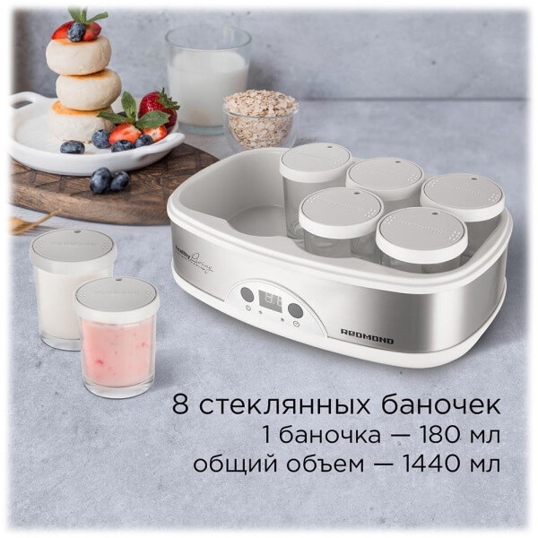 С йогуртницей REDMOND RYM-M5401-E вы можете легко приготовить его у себя дома. Удобное электронное управление с дисплеем позволяют точно установить время приготовления йогурта и отслеживать готовность с помощью таймера обратного отсчета.