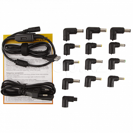 Ноутбуктерді, бейнелер мен камераларды, әртүрлі брендтердің мобильді құрылғыларын зарядтауға арналған автоматты кернеуді реттейтін және 13 ауыстырылатын саптамасы бар әмбебап ноутбук зарядтағышы.