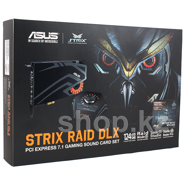 Strix Raid DLX представляет собой геймерскую звуковую карту премиум-класса, созданную на базе высококачественных компонентов, которая может похвастать чистым и детальным звучанием с соотношением сигнал/шум на уровне 124 дБ. Встроенный усилитель для наушников позволяет подключать к звуковой карте наушники аудиофильского класса с импедансом до 600 Ом. В комплект поставки устройства входит утилита Sonic Studio для гибкой настройки всех нюансов звучания.