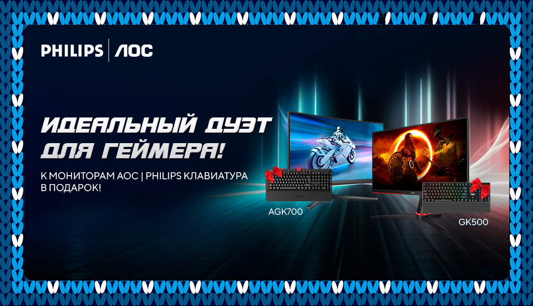 При покупке игровых мониторов АОС или Philips получите в подарок игровую механическую клавиатуру AOC AGK700 MX Red Cherry или модель АОС GK500DR2R.