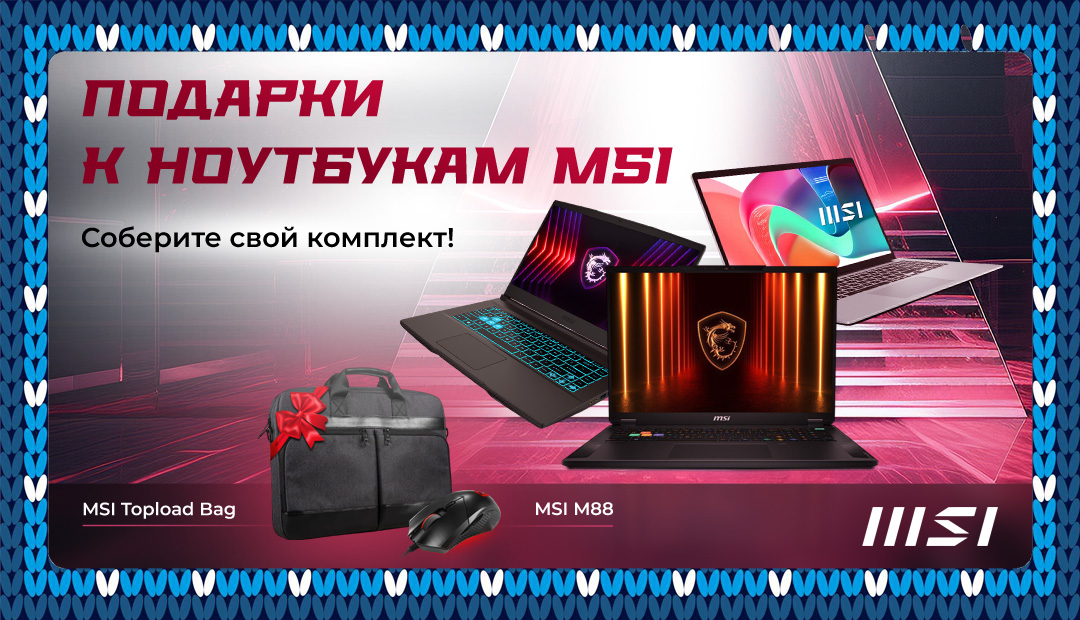 С 10 июня до 31 декабря 2025 года при покупке ноутбуков MSI получите подарок — мышь MSI M88 или сумку MSI Topload Bag в зависимости от модели.
