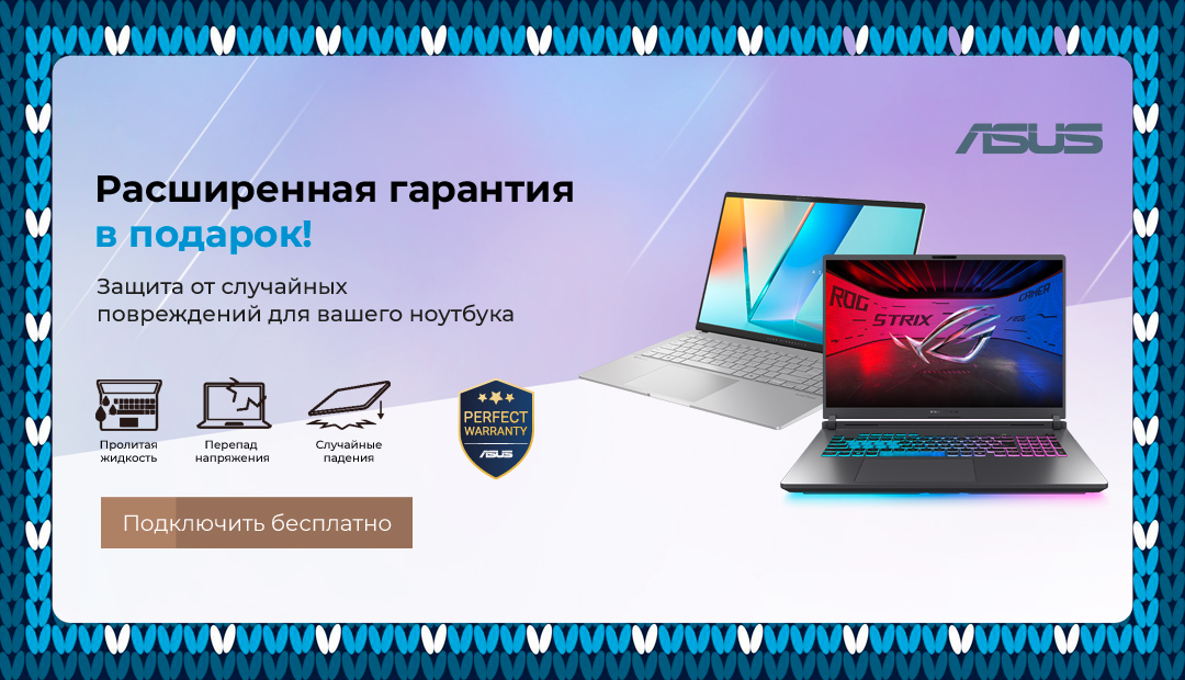 Продуктовые линейки, охватываемые гарантией ASUS Perfect Warranty: ноутбуки ASUS, Republic of Gamers и TUF, за исключением серий P, B, BR, Chromebook, купленные у авторизованных продавцов ASUS c 1 июля 2025 года в Казахстане.
