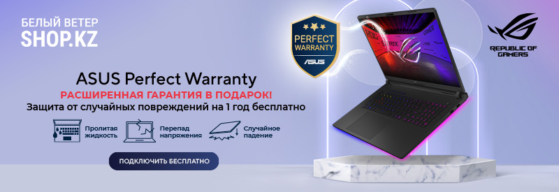 - Продуктовые линейки, охватываемые гарантией ASUS Perfect Warranty: ноутбуки ASUS, Republic of Gamers и TUF, за исключением серий P, B, BR, Chromebook, купленные у авторизованных продавцов ASUS c 1 июля 2025 года в Казахстане.