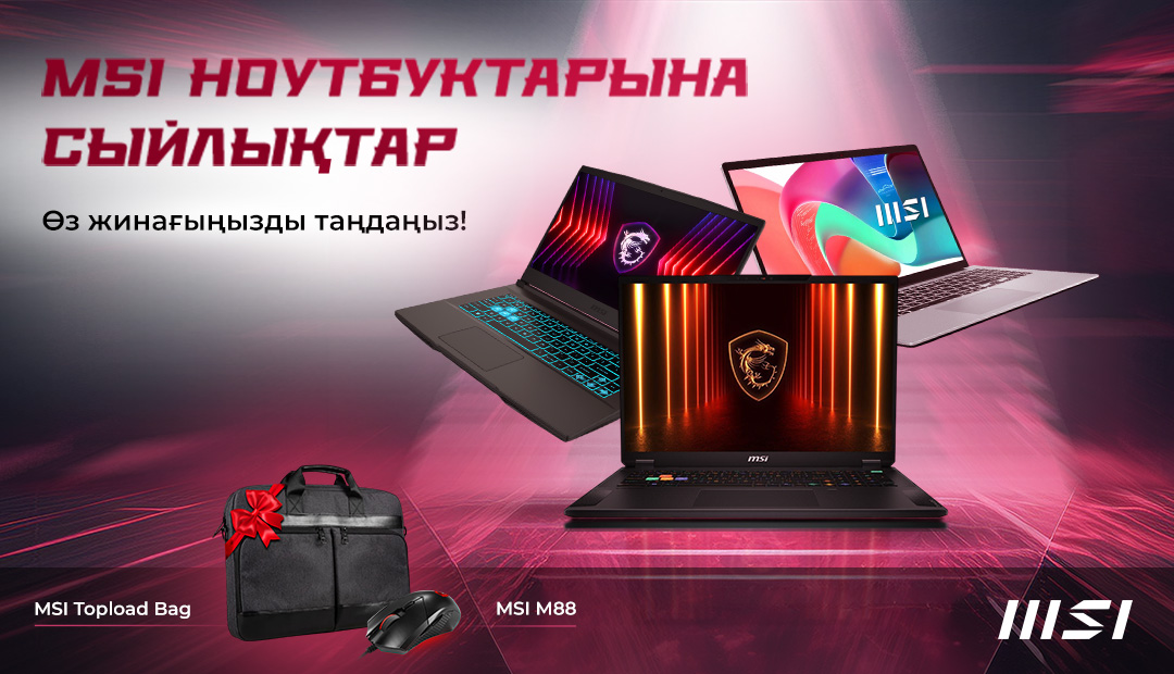 2025 жылы 10 маусымнан 2026 жылы 31 қаңтарға дейін MSI ноутбуктарын сатып алғанда, модельге байланысты MSI M88 тінтуірін немесе MSI Topload сөмкесін алыңыз.