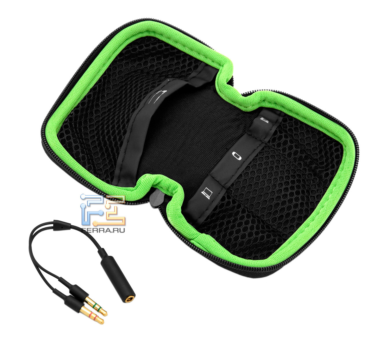 Razer Megalodon, как Кащеева смерть, упрятаны куда надежнее: гарнитура и блок управления звукового сигнала находятся в твёрдом чехле для переноски, он — во внушительной коробке из плотного картона, а та — в ярком и примечательном подобии «суперобложки».