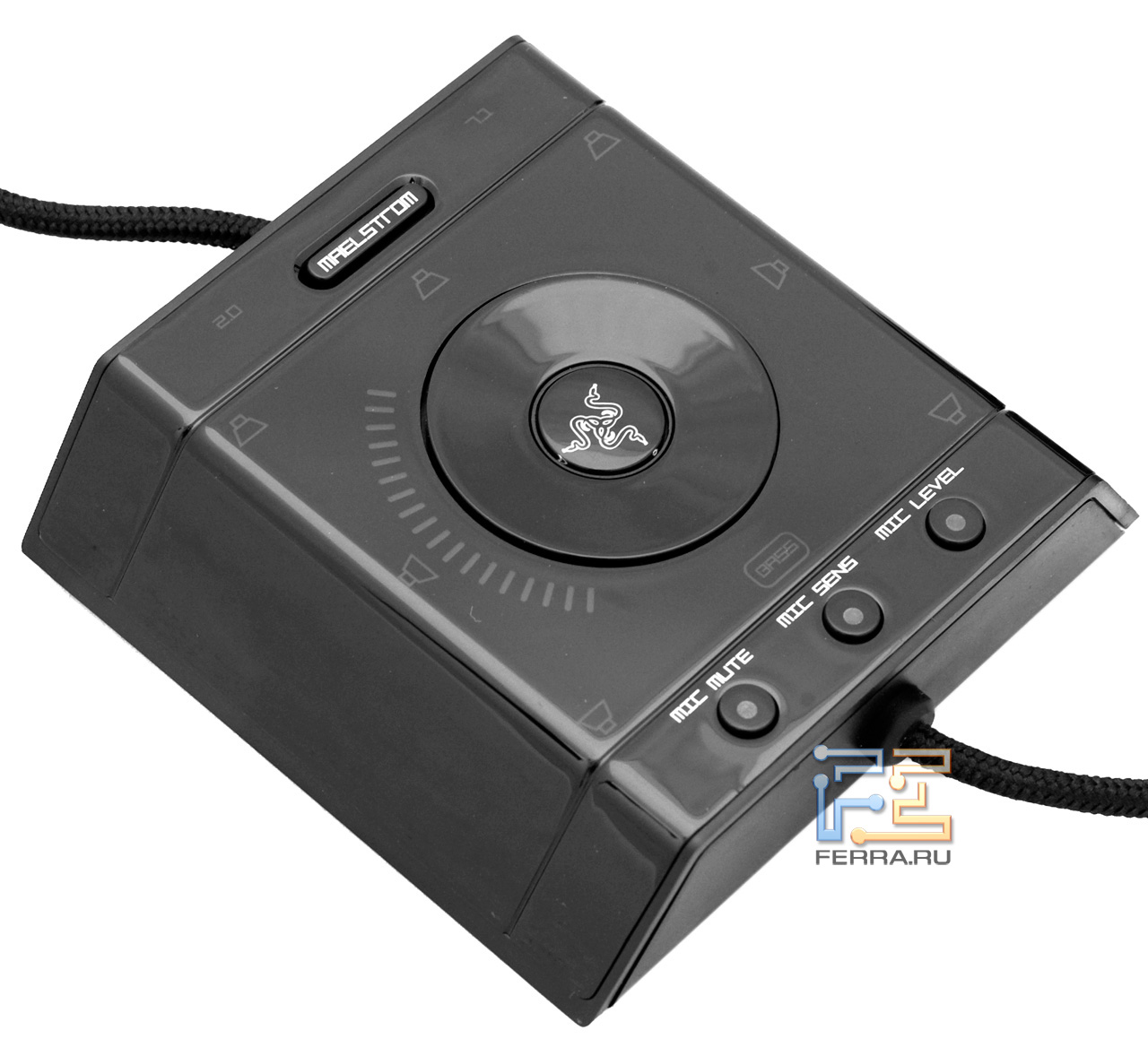 Прежде всего, он позволяет быстро переключать гарнитуру из режима 2.0 в режим 7.1, одновременно активируя систему обработки звука Razer Maelstrom Audio Engine (по ссылке на сайт производителя вы можете прочесть о ней подробную информацию). Вы также сможете регулировать уровень громкости наушников, выборочно активировать каналы (например, только фронтальный центральный, или тыловые боковые), включать «басы», выставлять уровень и чувствительность микрофона, приглушать (mute) по отдельности наушники и микрофон. Фактически, создатели Razer Megalodon отказались от написания программной оболочки для настройки звука, переложив ее функции на блок обработки звукового сигнала. Логичное, а главное, удобное решение.