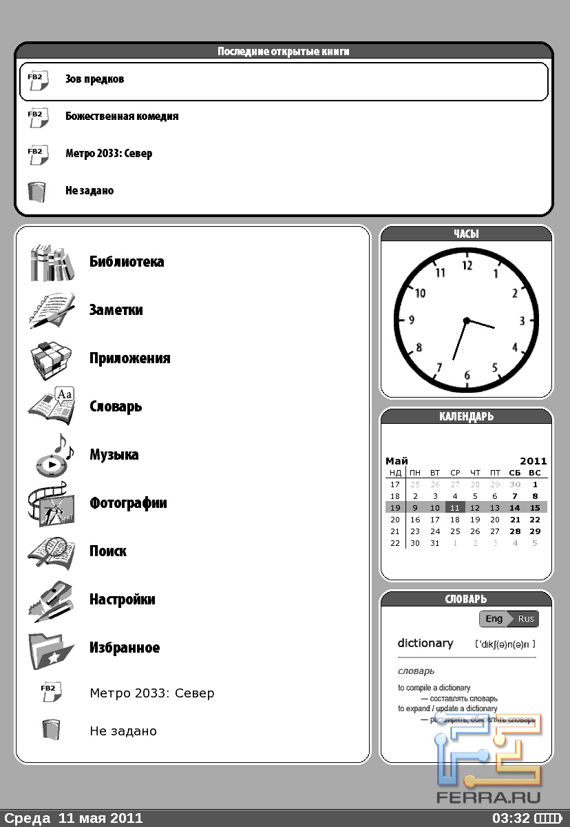 Отображение графических файлов и воспроизведение музыки — это уже стандартные функции ридеров, позволяющие производителям вставлять в описания красивое слово «мультимедийный». Разумеется, рассматривать фотографии на чёрно-белом экране совсем не весело, а плееры в ридерах редко умеют работать даже с ID3-тегами. Плеер в PocketBook Pro 902 не умеет.