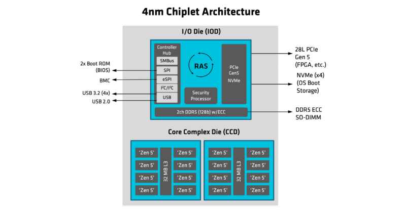 Новая серия реализована в компактном корпусе BGA размером 40×40 мм это делает её значительно меньше (в 2.4 раза), чем соответствующие решения конкурентов. Одновременно EPYC Embedded 2005 предлагает до 64 МБ кэша L3 и поддержку DDR5, что вкупе с низким энергопотреблением обеспечивает высокую плотность вычислений и экономию на системных затратах