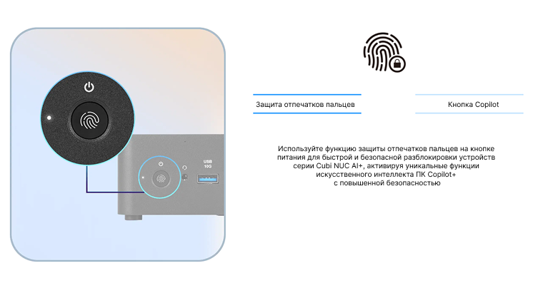 Мини-ПК предлагает различные порты для подключения, включая USB-A, Thunderbolt 4 и Ethernet для подключения к интернету. Он также оснащен встроенным микрофоном, динамиком и функцией распознавания отпечатков пальцев для повышения безопасности. Устройство поддерживает Microsoft's Copilot+ и предлагает ряд AI-возможностей, таких как "Живые субтитры" и "Ко-производитель".