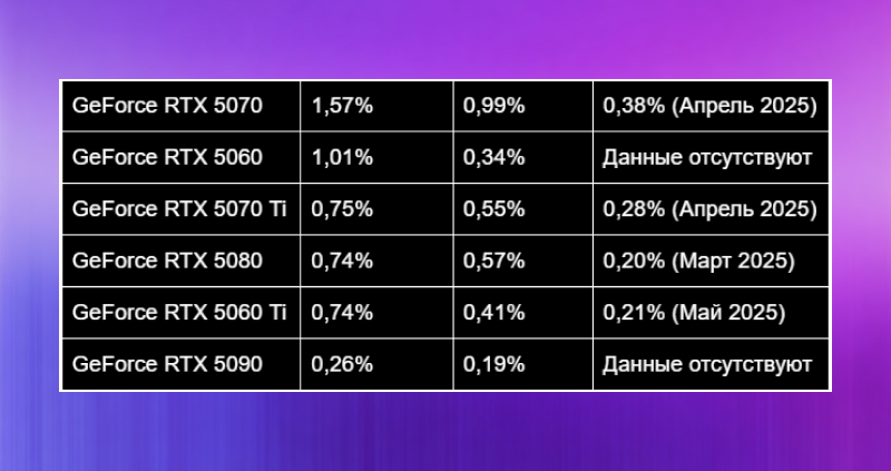 Новые видеокарты NVIDIA RTX 50 серии медленно, но верно завоёвывают рынок. Однако до попадания в топ самых популярных GPU им ещё далеко. Об этом свидетельствуют свежие данные августовского опроса Steam - крупнейшей игровой платформы в мире.