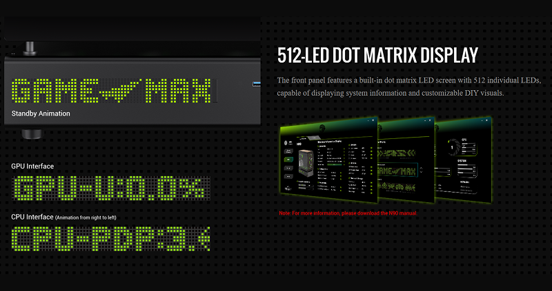 Главная особенность корпуса N90 - встроенный 512-светодиодный точечный матричный дисплей на передней панели, который позволяет отображать системную информацию в реальном времени, такую как температура или скорость вращения вентиляторов, а также персонализированные дизайны. Дисплей способен показывать системную информацию и настраиваемые визуалы, что открывает широкие возможности для кастомизации.