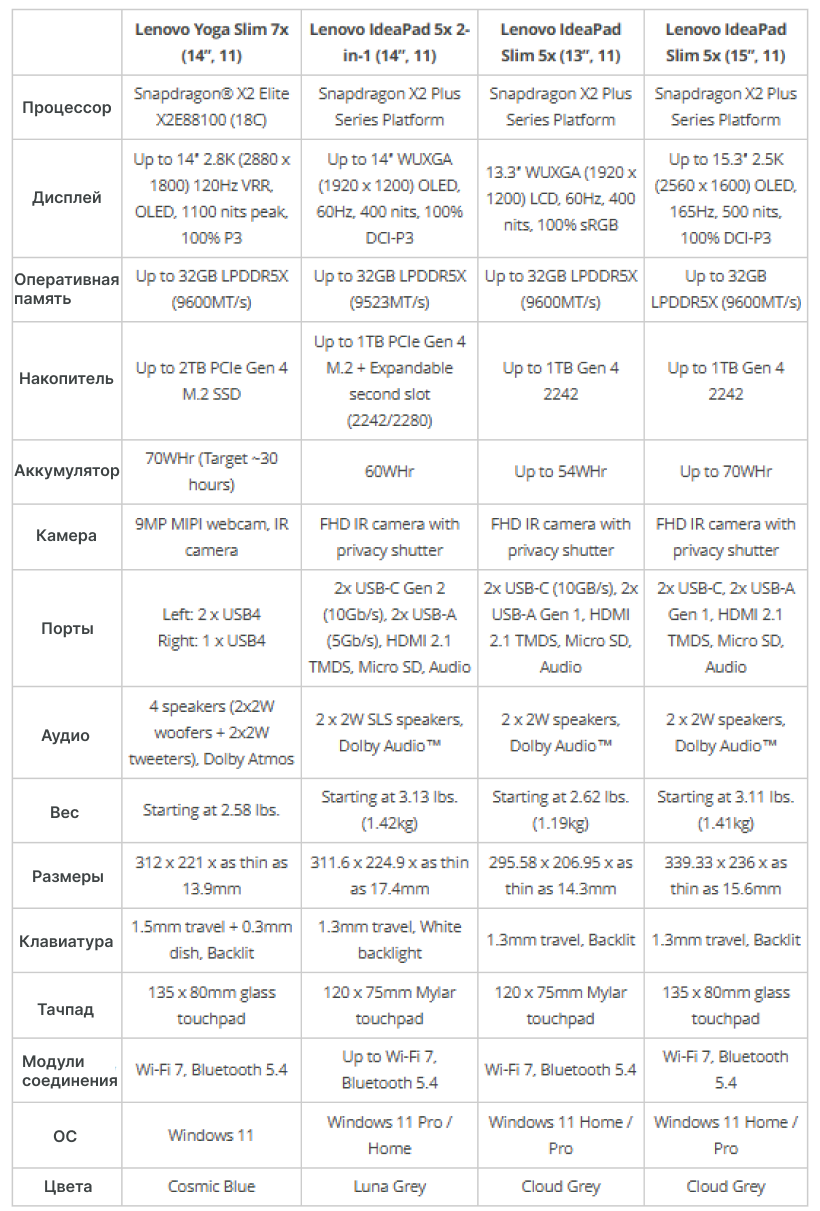 Lenovo готовит внушительную линейку тонких и легких ноутбуков на новых процессорах Snapdragon X2 для CES 2026. С OLED-дисплеями, большими батареями и поддержкой Copilot+ эти устройства обещают стать конкурентоспособными вариантами в премиум-сегменте мобильных ПК.