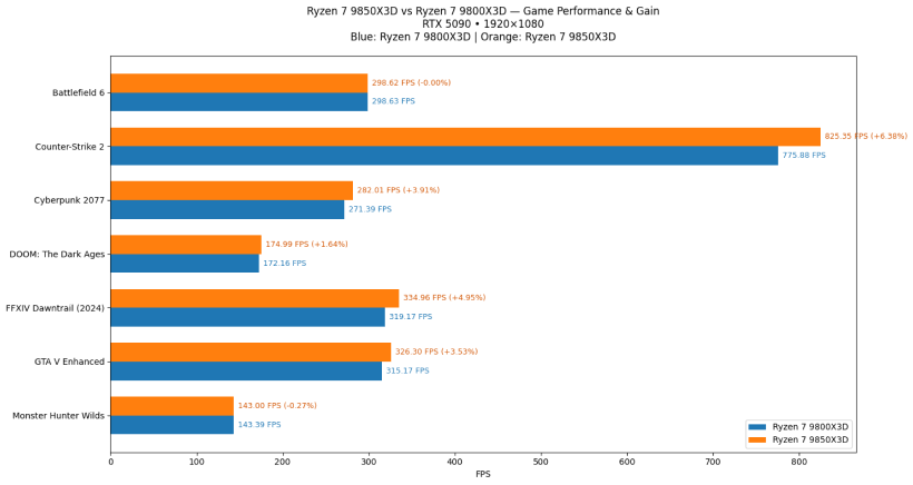 В таких играх, как Battlefield 6, Monster Hunter Wilds и Doom: The Dark Ages, практически не было никаких улучшений. Но в играх вроде GTA V: Enhanced, Final Fantasy 14 Downtrail и Cyberpunk 2077 процессор 9850X3D на 3,53-4,95% быстрее. Это очень небольшой прирост, который останется незамеченным, а максимум, чего смог достичь 9850X3D, — это 6,38% в Counter-Strike 2, той же игре, где он ранее достиг в среднем более 900 FPS. На этот раз он преодолевает отметку в 800 FPS, но мы не знаем точные графические настройки.
