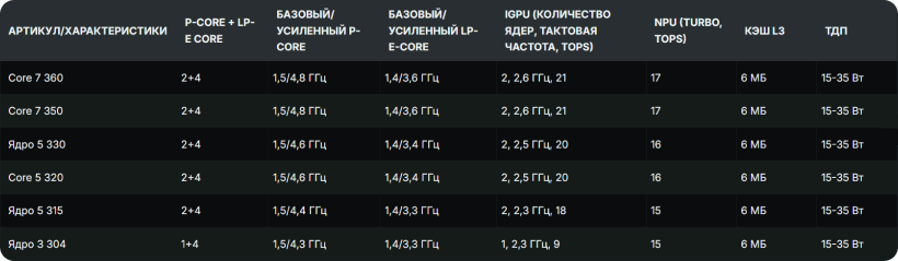 Что касается числа ядер: за исключением Core 3 304, все SKU построены на конфигурации 2 P-Core + 4 LP-E Core, что соответствует ранее появлявшимся слухам. Флагманом линейки станет Core 7 360 с турбочастотой P-Core до 4,8 ГГц и турбочастотой LP-E-ядер до 3,6 ГГц. Базовая частота у всех SKU составит 1,5 ГГц для производительных ядер и 1,4 ГГц для LP-E-ядер. Важно отметить, что это те же ядра Cougar (Performance) и Darkmont (LP-E), что используются в линейке Panther Lake.